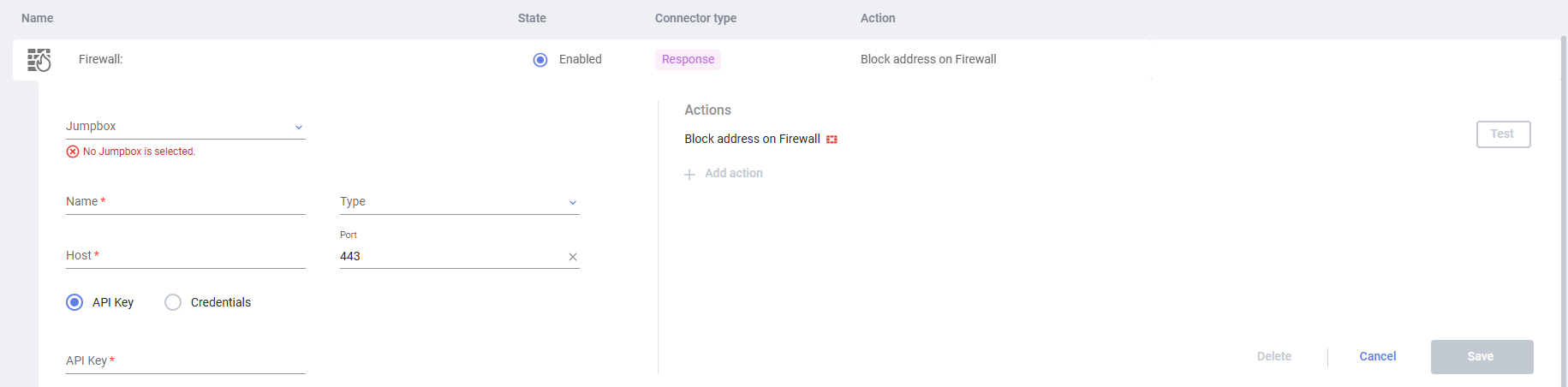 Host Specify the IP or DNS address of your firewall. Port Specify the port that is used for API communication with your firewall. API Key / Credentials Specify authentication details of your firewall. To use an API token, click the API Key radio button and copy the token value into the text box. To use API credentials, click the Credentials radio button and enter the Firewall API username and password. - In the Actions area on the right, define an action to be taken by this connector.