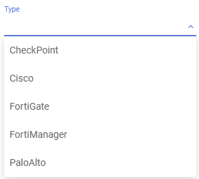 Jumpbox Select the EDR Jumpbox to communicate with the firewall. Name Specify a name of your choice to be used to identify this firewall. Type Select the type of firewall to be used in the dropdown list.