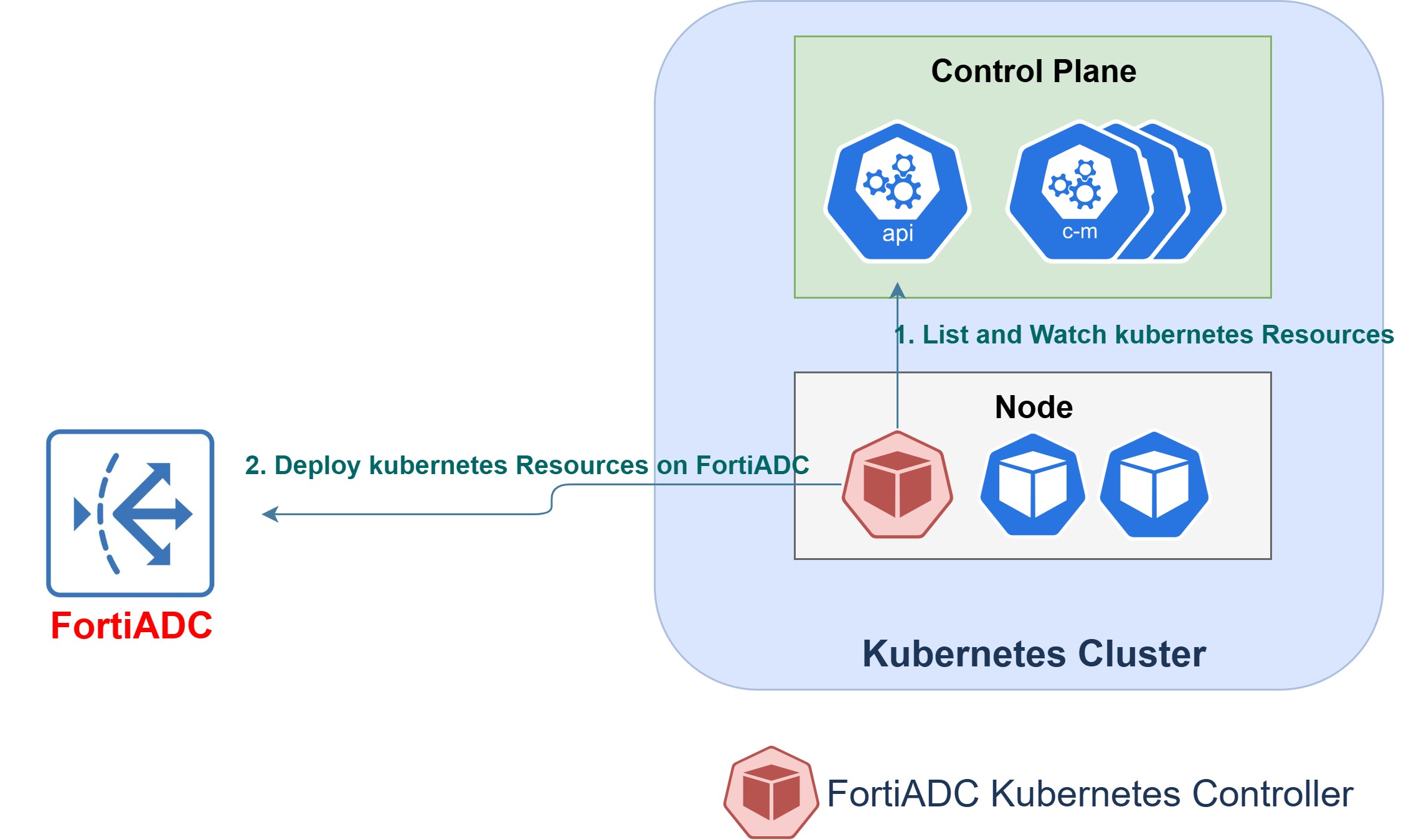 | Controller Pod | Runs the FortiADC Kubernetes Controller inside the cluster and manages communication with both the Kubernetes API Server and FortiADC. |