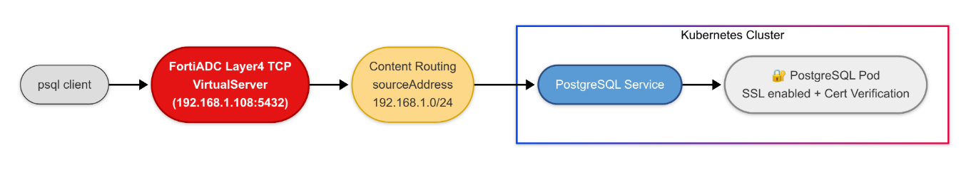 This scenario demonstrates how to securely expose a PostgreSQL database service. By using a Layer 4 TCP VirtualServer, FortiADC acts as a high-performance proxy, providing a single entry point for database traffic while offloading SSL processing and managing real-server persistence.