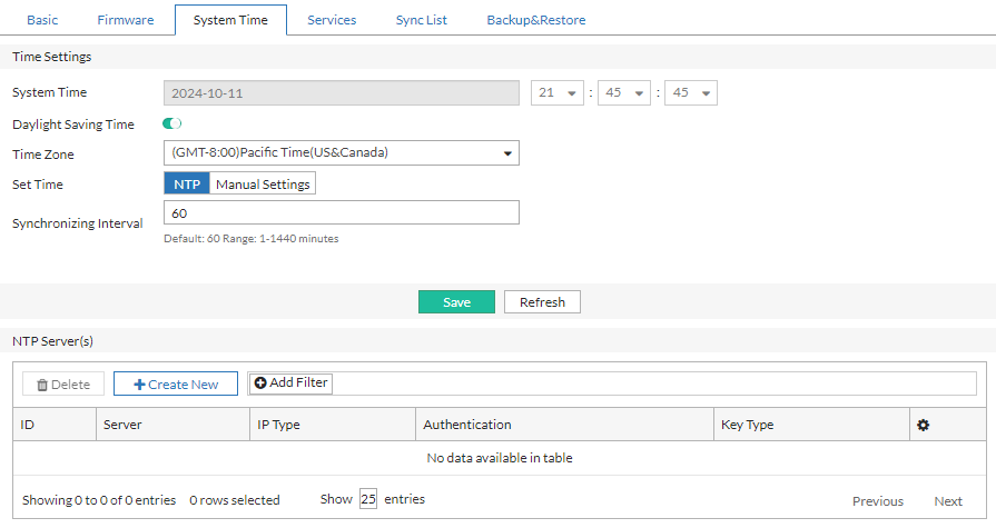 If the system time is based on NTP, the NTP Server(s) section becomes configurable once the Time Settings configuration is successfully saved. - Under the NTP Server(s) section, click Create New to display the configuration editor.