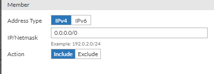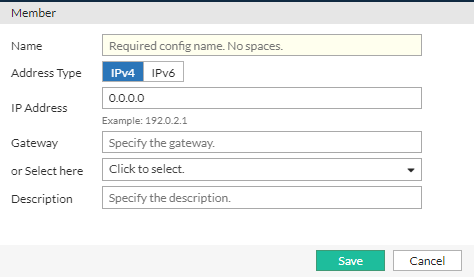 Under the Member section, click Create New to add IP addresses. Save the configuration and repeat to create as many address objects as needed to include in the Address Group.