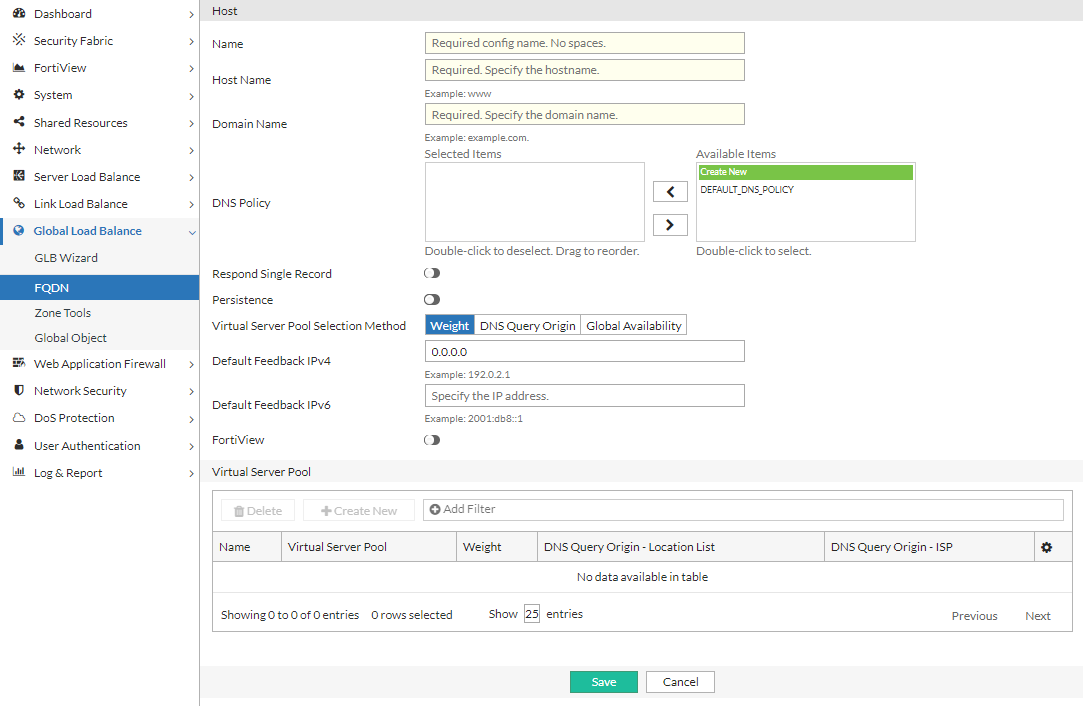 Under the Virtual Server Pool section, click Create New to display the configuration editor. Configure the required settings and save the configuration.