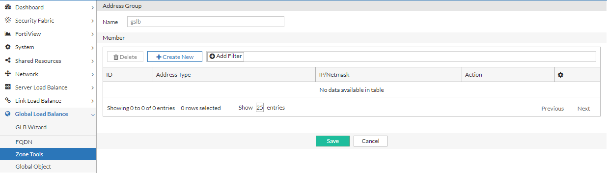 Click Create New to display the configuration editor. Enter a name for the Address Group and click Save to enable configuration for the Member section.
