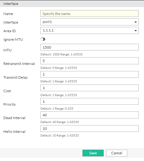 Name Configuration name. Valid characters are A-Z,a-z,0-9,_, and-. No spaces. After you initially save the configuration, you cannot edit the name.Interface Select the interface on which to enable OSPFv3. Area ID Select the Area ID. Ignore MTU Ignores MTU mismatches between OSPFv3 neighbors. This is disabled by default. MTU Specify the maximum packet size for transmission. The default value is 1500, and the valid range is 1-65535. Retransmit Interval Specify the interval between LSA retransmissions when acknowledgements are not received. The default value is 5 seconds, and the valid range is 1-65535. Transmit Delay Additional time added to the LSA age during transmission. The default value is 1 second, and the valid range is 1-65535. Cost