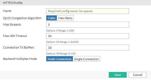 Name Specify a unique name for the HTTP3 profile. Valid characters are A-Z,a-z,0-9,_, and-. No spaces. After you initially save the configuration, you cannot edit the name.QUIC Congestion Algorithm FortiADC supports Cubic and New Reno loss-based congestion control for QUIC, where the congestion control responds to packet loss events.