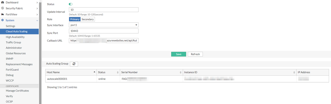 FortiADC supports cloud autoscaling for Azure and AWS platforms. Once autoscaling is deployed on the cloud, the status of FortiADC devices can be monitored through the GUI of the primary node. FortiADCs can be in one of two states: