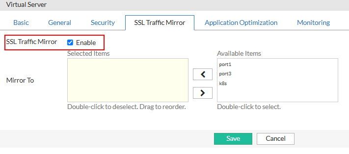 FortiADC supports mirroring packets (HTTPS/TCPS) to specified network interfaces. When the feature is enabled, SSL traffic will be mirrored to the specified ports by the virtual server after it has been decrypted. See the following figures.