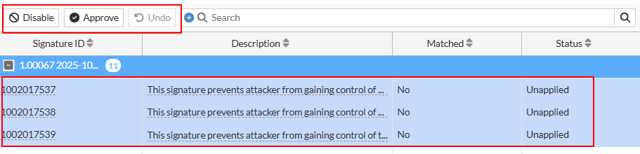 Approve: Enables the selected signature for active enforcement. Once applied, the signature remains listed for reference but becomes part of the active WAF signature set.