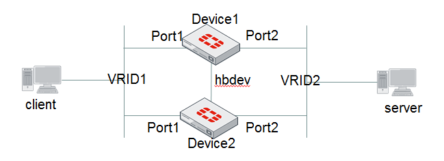 In Traffic group, both VRID1 and VRID2 use Device1 as the primary. When Port2 on Device1 fails, all traffic between the client and the server can't pass through the device