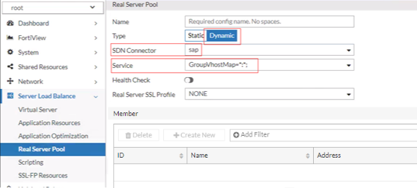 When you create an SAP connector, you are authorizing FortiADC to periodically (default 30s) get information of SAP instances and dynamically populates it in server pool configuration.