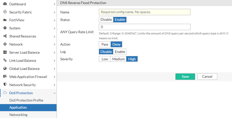 After configuring the DoS Protection Profile and the DNS Application Profile, the next step is to associate them with your Server Load Balancing (SLB) configuration. This integration ensures that all incoming DNS traffic directed to backend servers is monitored and managed according to the predefined traffic management rules and DoS protection policies. By binding the DNS Profile and DoS Protection Profile to the SLB configuration, FortiADC can effectively detect and mitigate potential DDoS attacks while maintaining consistent traffic distribution and high availability across the server pool.