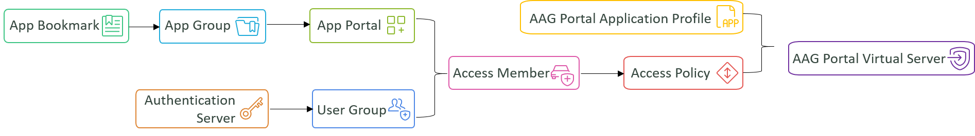 FortiADC’s Agentless Application Gateway (AAG) consists of several configuration components that work together to deliver secure, role-based access to remote and internal applications.
