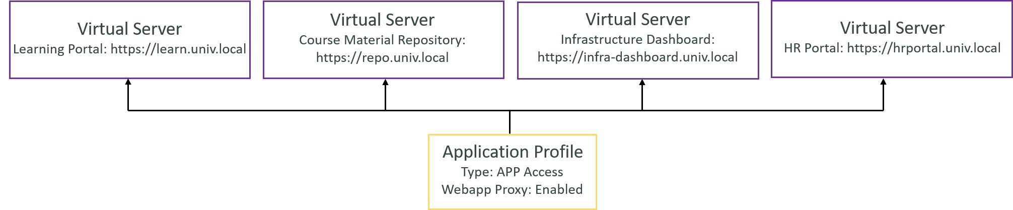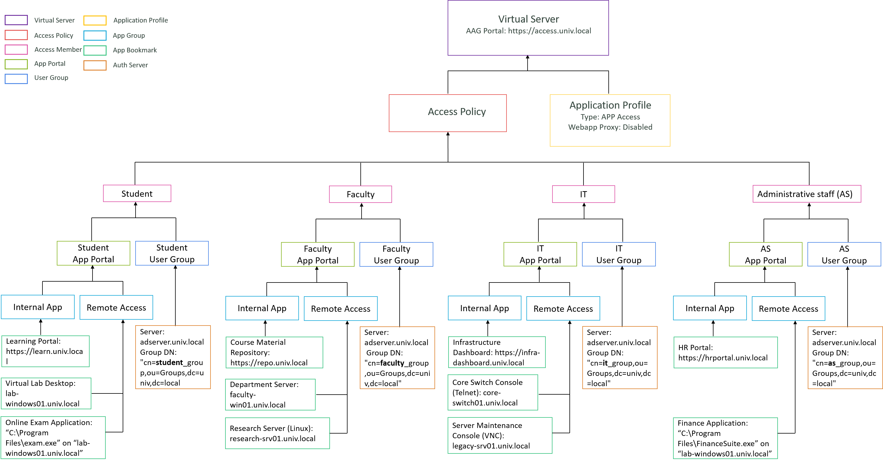 How you design the hierarchy of App Portals and App Groups depends on the complexity of your access requirements. For instance, you can create a Student App Portal, and under it, configure one App Group for all remote access servers and another App Group for internal web applications.