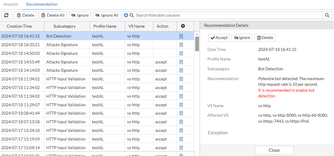 | Affected VS | Lists the virtual servers that will be affected by the action taken for this recommendation. |