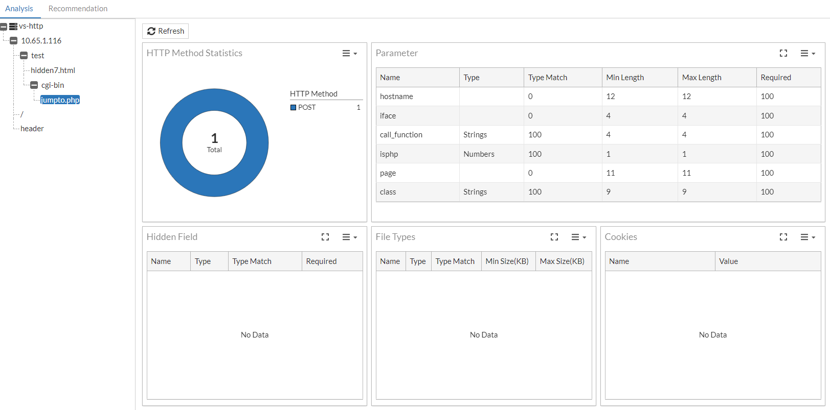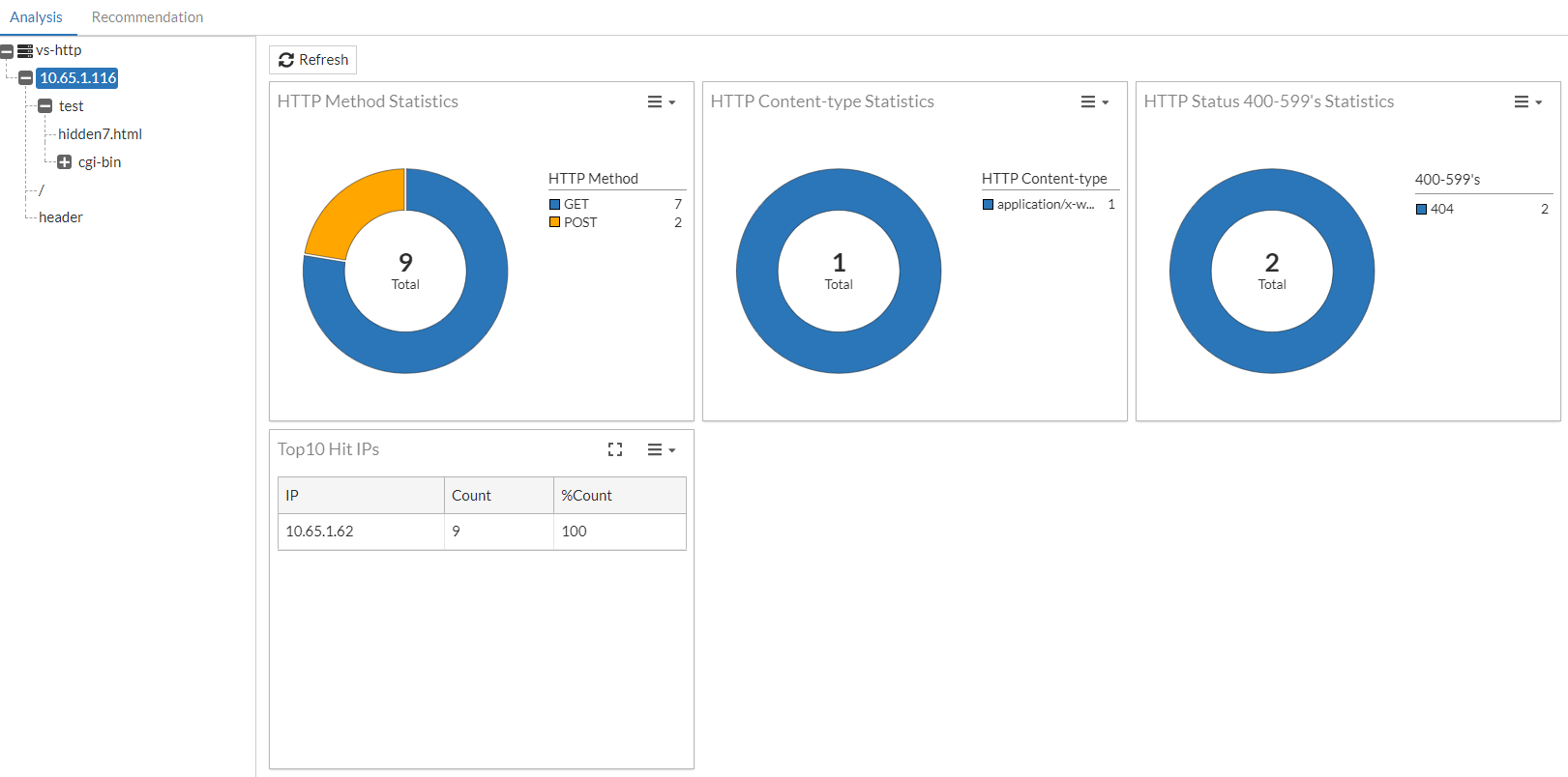The Analysis page provides graphical representations of the statistical outputs generated from the WAF Adaptive Learning engine. This page features a navigation tree that allows you to drill down to various levels of data. Each view presents a dashboard composed of various widgets that can be moved and resized. Statistics may be presented as tables or circle graphs that break-down the percentage against the total count.