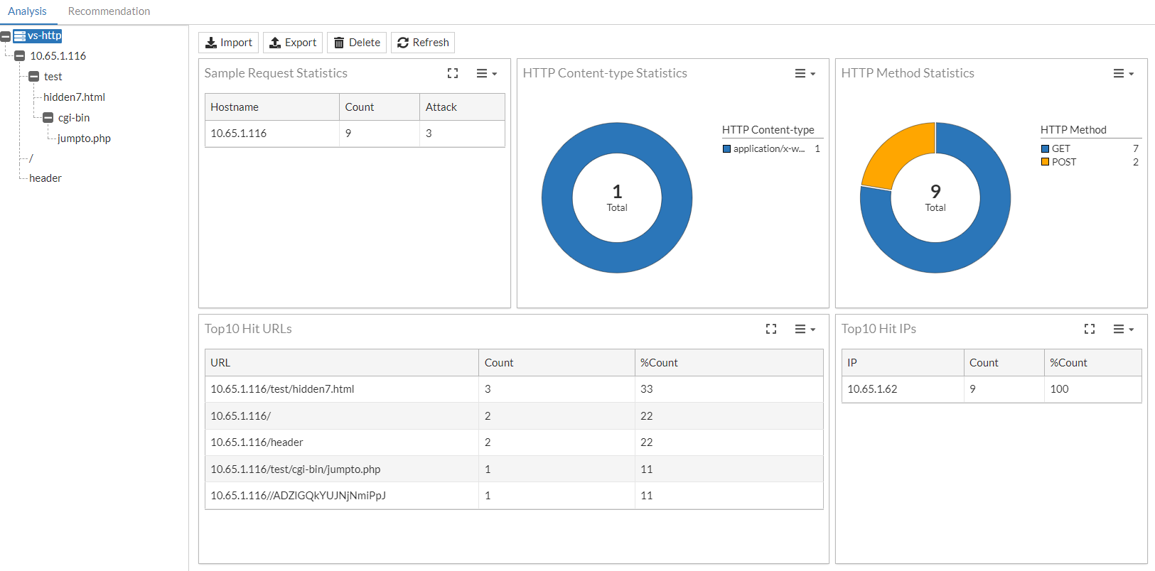 Export — The virtual server URL tree (.xml) and associated statistics (.bin) will be compressed into a .zip file and downloaded automatically. The .bin file statistics for each URL includes the parameters, hidden fields and other information that are used to determine if a recommendation should be generated.