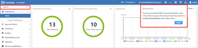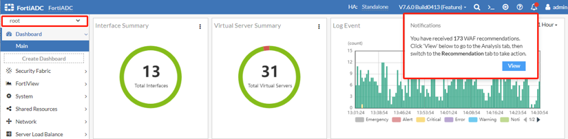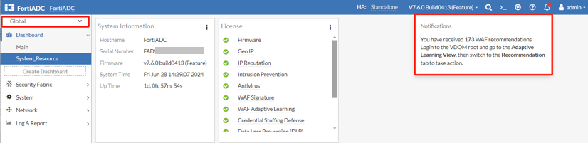 Adaptive Learning generates notifications for each unresolved recommendation. The displayed recommendation count differs based on the context in which the notification is viewed, either from the Global VDOM or specific VDOMs (root or non-root). In the Global VDOM, the recommendation count aggregates only those generated within the root VDOM. Conversely, when viewed from individual VDOMs, the count reflects recommendations generated exclusively within the respective VDOM.