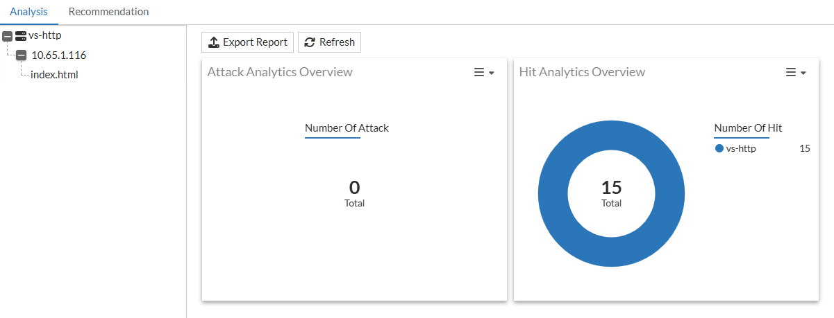 The Overview dashboard serves as the landing page of the Analysis tab. Here, you can view the Attack Analytics Overview and Hit Analytics Overview graphs that provide a comprehensive overview of the statistics collected from all virtual servers with Adaptive Learning enabled.