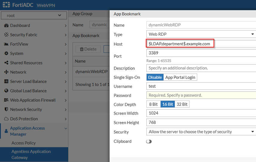 When connecting to an LDAP server for user authentication, FortiADC can extract user attributes from the LDAP directory and use these values dynamically in the Host field of an App Bookmark. This allows different users to connect to different backend hosts using the same App Bookmark.