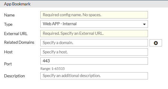 Before you configure this bookmark, ensure that the internal application has already been published on a FortiADC virtual server configured with Web App Proxy (HTTP or HTTPS). The virtual server provides the reverse-proxy function that handles session termination and authentication redirection, while the Web App – Internal bookmark links that published resource to the App Portal. For details, see Publishing Internal Web Applications for AAG Access.