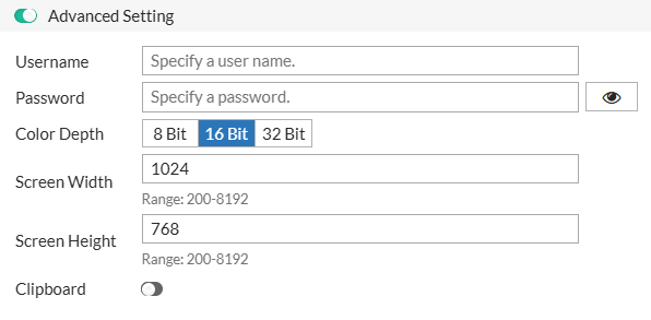 | Port | The port used for the RDP connection (default: 3389, range: 1-65535). |