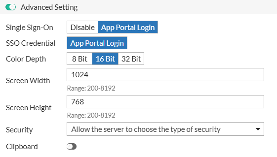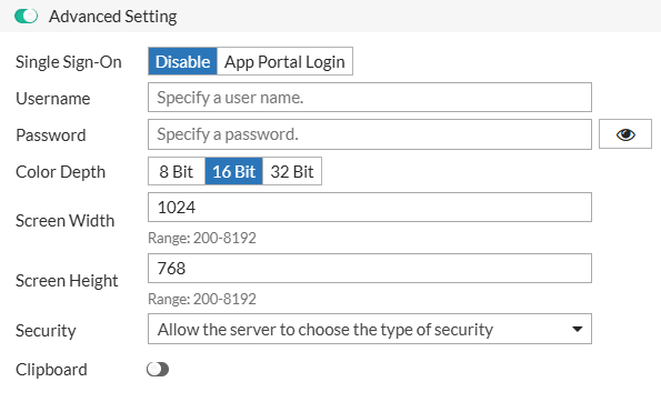 | Port | The port used for the RemoteApp connection (default: 3389, range: 1-65535). |