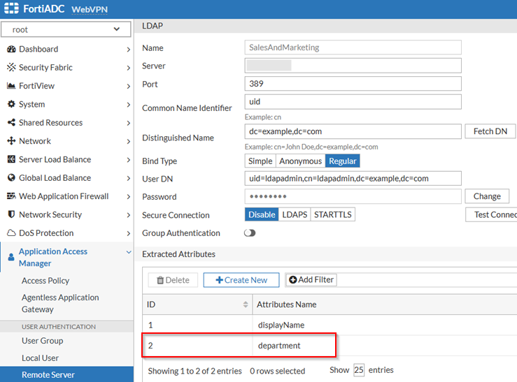 For example, suppose the LDAP server contains a user attribute named department. After authentication, FortiADC retrieves this attribute for the logged-in user.