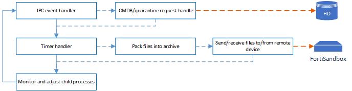 It’s a multi-process daemon, which receives quarantine requests from the AV daemon and then processes the requests in child processes. It can work in tandem with remote devices to compliment the AV service, such as sending suspicious files to FortiSandbox for deeper inspection or uploading the archive package onto FortiCloud.
