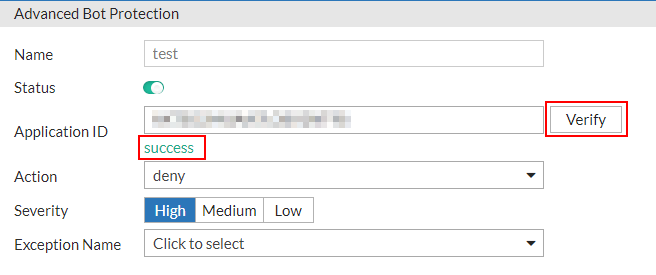 - Optionally, click Verify to validate the inputted Application ID against multiple parameters to ensure the connection between FortiADC and the FortiGuard ABP Application is successfully established.