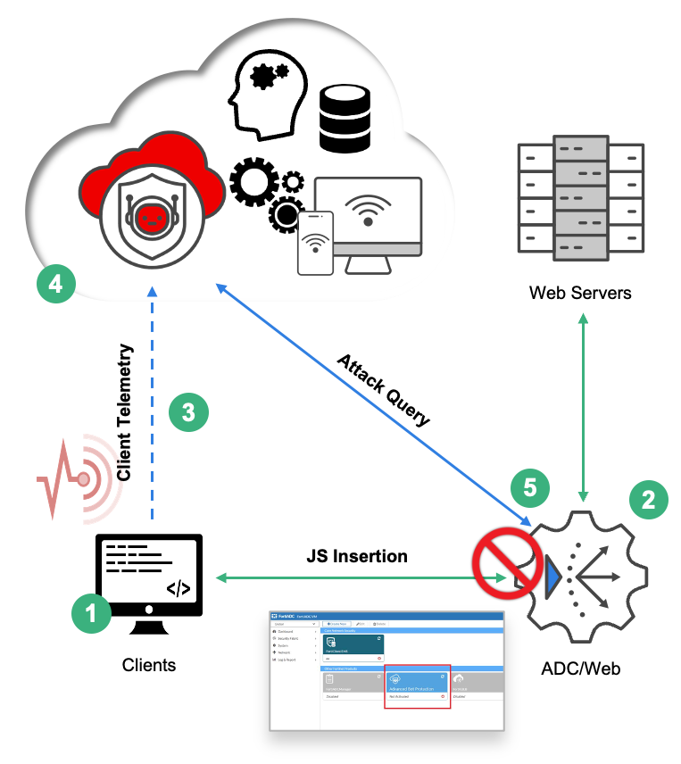 | 3 | The client and FortiADC (via Fabric connector) share telemetry data (such as IP, headers, and device fingerprinting) with the Advanced Bot Protection engine. |