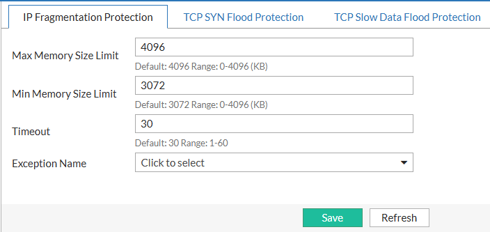 When the memory usage for fragmented packets reaches the configured Max Memory Size limit, FortiADC stops reassembling fragments and drops new fragmented traffic. However, if the source IP of a fragmented packet matches an exception rule, FortiADC continues to accept and forward the packet, bypassing the memory enforcement restriction.