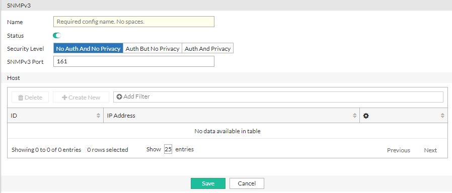 After the SNMP v3 configuration is saved, the Host section becomes available to configure.