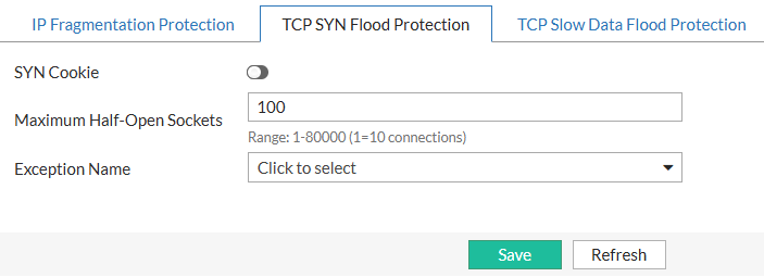 The configuration page displays the IP Fragmentation Protection tab. - Click the TCP SYN Flood Protection tab.