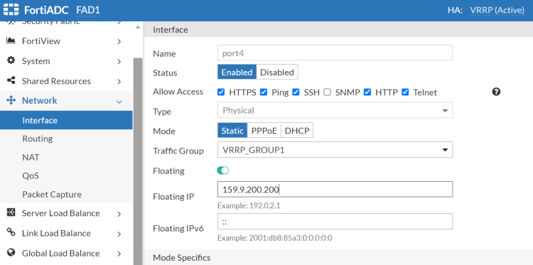 Note that the floating IP only functions within the Primary traffic group. In this example, port2 is part of VRRP_Group1, with FAD1 currently serving as the Primary for VRRP_Group1. As a result, the IP address '159.9.200.200' is currently active on FAD1. If FAD1 fails, FAD2 will assume the role of Primary for VRRP_Group1, and the IP address '159.9.200.200' will then become active on FAD2.