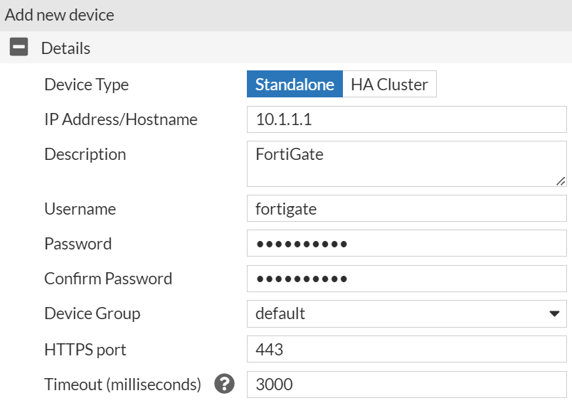 Specify the Timeout duration (milliseconds), that is, the maximum time allowed to establish a connection with FortiGate and obtain a response. The default value is 3000 milliseconds.