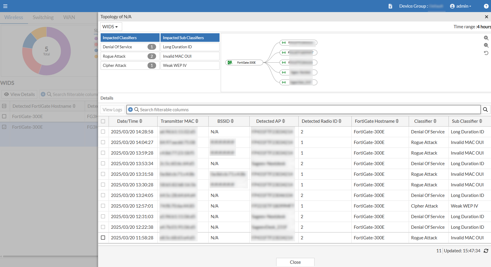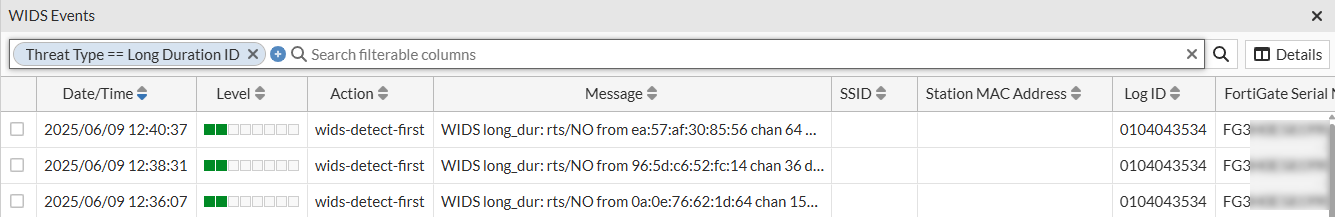Click on a Threat Type to open WIDS Events pane with details for the filtered threat type.