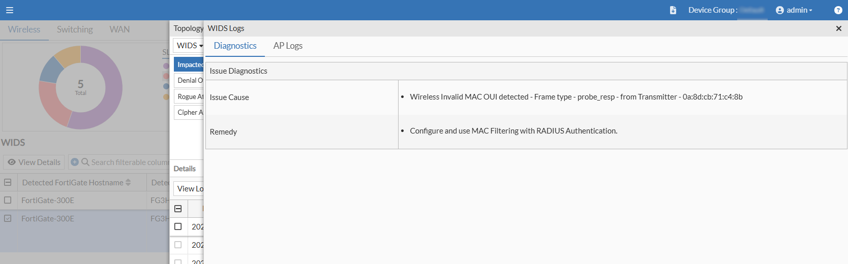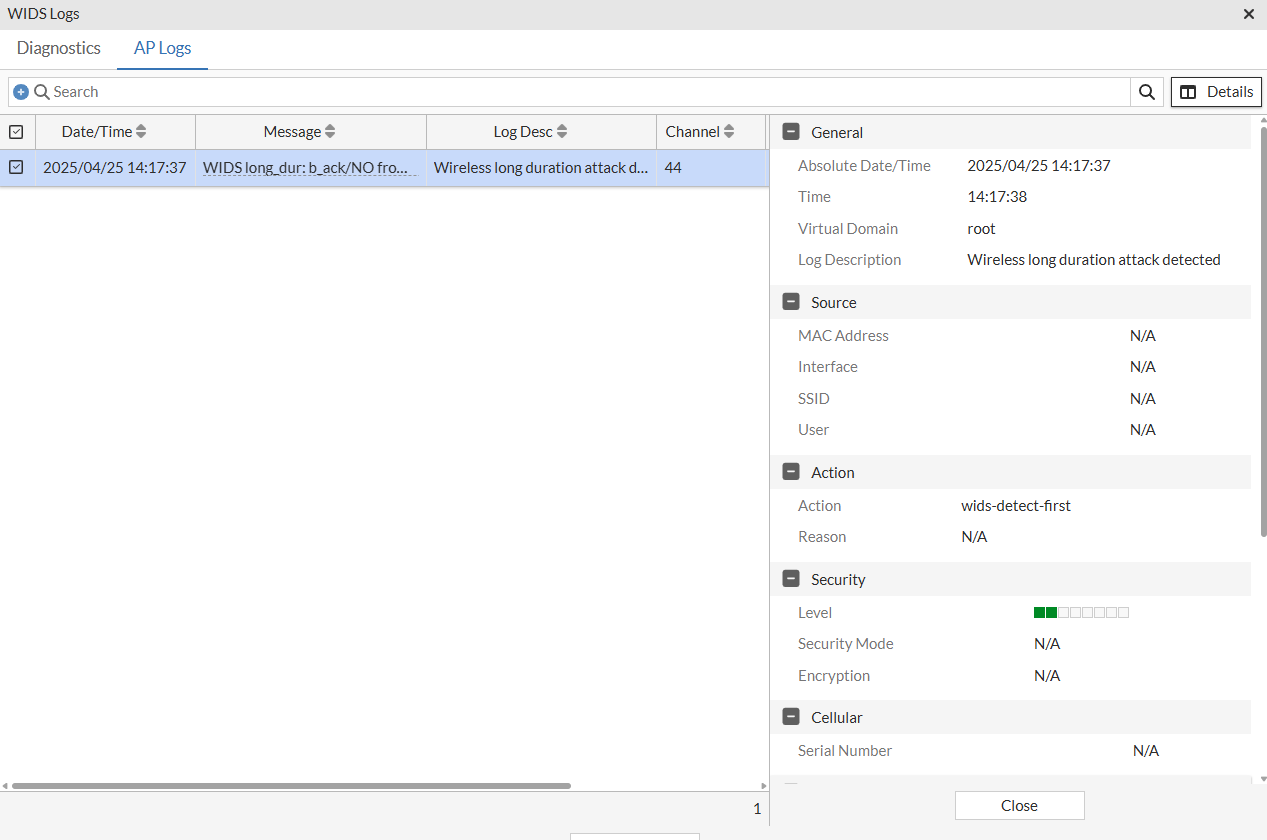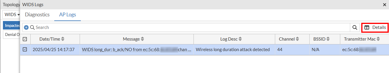 Select a specific row and click View Logs. The WIDS Logs window displays detailed logs in two tabs namely – Diagnostics and AP Logs.