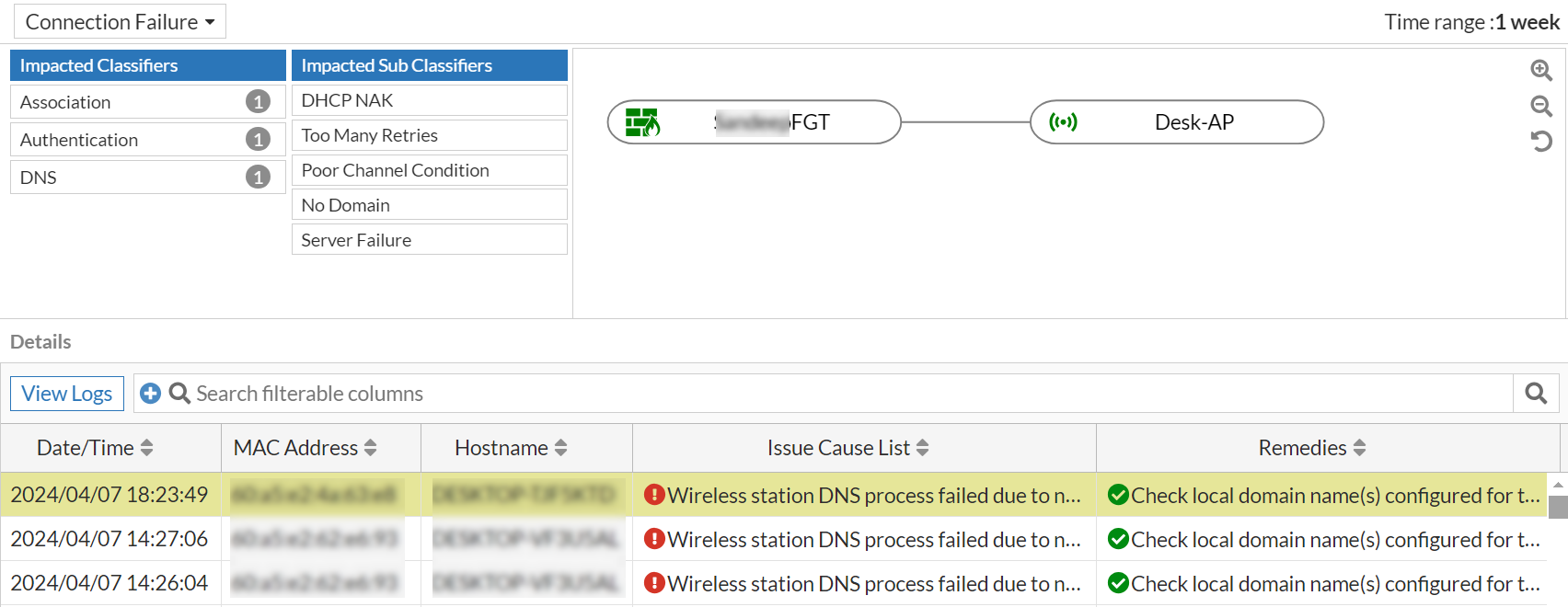 In the AP events displayed, select an event and click View Logs.