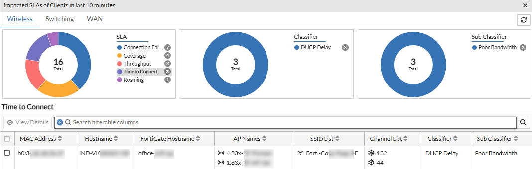 If you select the Clients view in the Wireless panel and click on any SLA in the impacted SLAs list or click on the bar in the chart, the impacted client details, such as, MAC address, hostname, associated SSID and channels, the AP name, IP address, and serial numbers, the associated FortiGate hostname and serial number, and the classifier and sub-classifers are displayed.