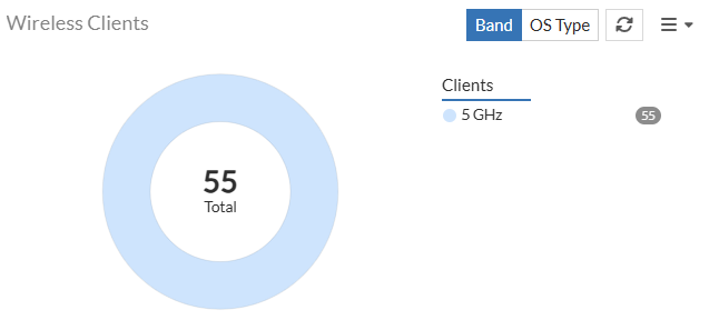 This chart displays the total number of connected clients with their Band categorization of 2.4GHz, 5GHz, and 6GHz. This panel also provides representation for clients based on the OS Type.
