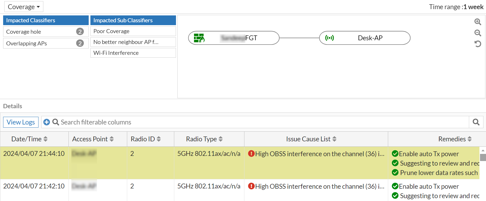 The AP Logs tab displays details of the event such as time of the event, error message and log of the event, and details of channel, BSSID, and Transmitter MAC address.
