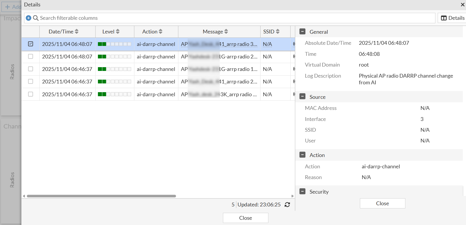 The table in the Details pane provide details such as Date/Time, Level, Action, Message, SSID, AP Name, Log ID, FortiGate Serial Number, and Channel.