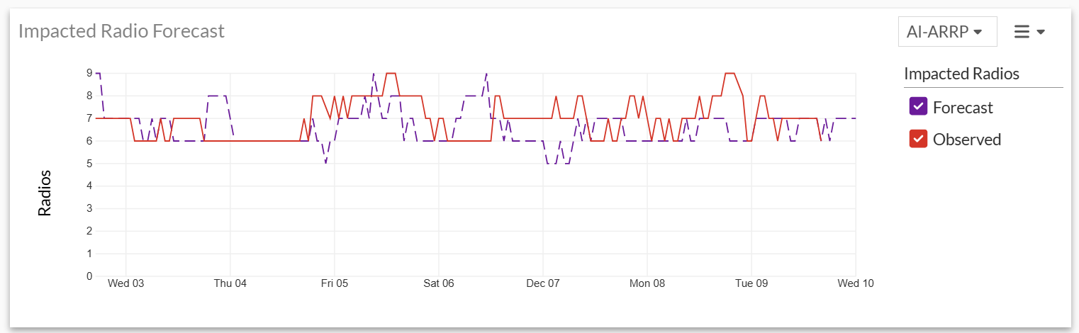 Forecast: This line shows the predicted count of impacted radios that the AI-ARRP model estimates will be impacted.
