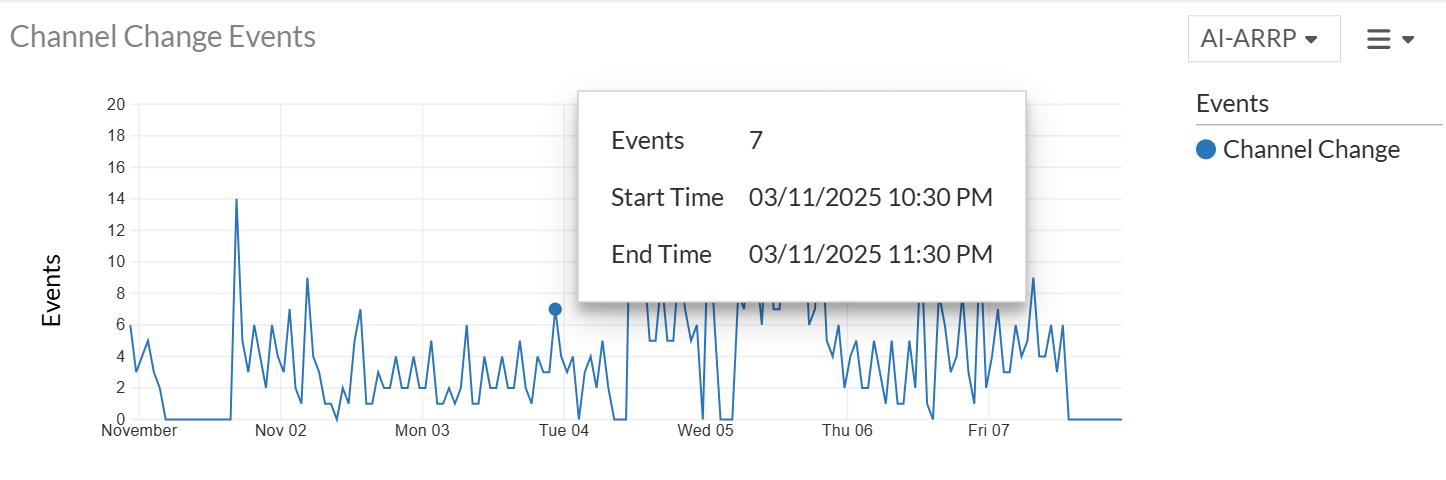 This chart provides detailed visibility into all channel change events triggered by the radio provisioning system. It captures channel changes initiated through both AI-ARRP from FortiAIOPs and DARRP from Fortigate.