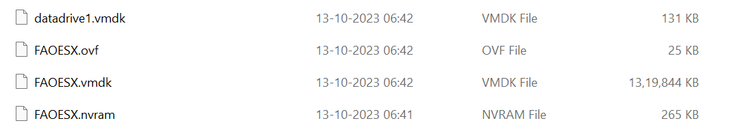 Download the installation file from Fortinet Support portal and unzip the file (FAO_VM64-vx.x.x-devbuildxxxx-FORTINET.out.ovf.zip). This folder contains 4 installation files.