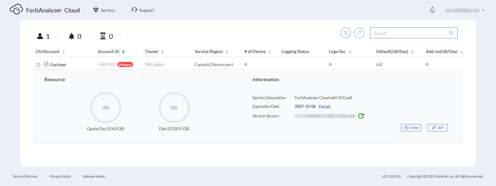 The account details are displayed. If it is a primary account, you can provision a new instance. See Deploying a FortiAnalyzer Cloud instance.