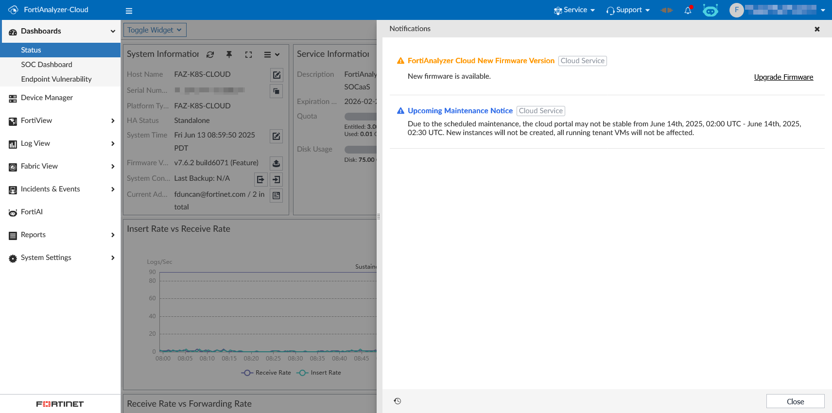 In FortiAnalyzer Cloud 7.4.3 and later, administrators must perform firmware upgrades from within the FortiAnalyzer Cloud Dashboard or firmware upgrade notification drawer.