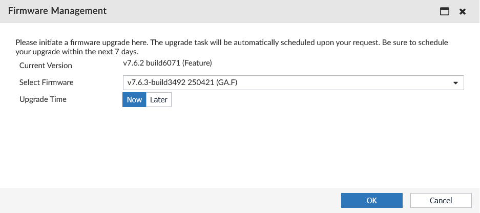 When a firmware upgrade is mandatory, a Firmware Management dialog window will appear when you access your instance. This dialog provides details about the upgrade deadline and options for upgrading your firmware version. You can choose to upgrade immediately or schedule the upgrade for a later time. This dialog cannot be bypassed.