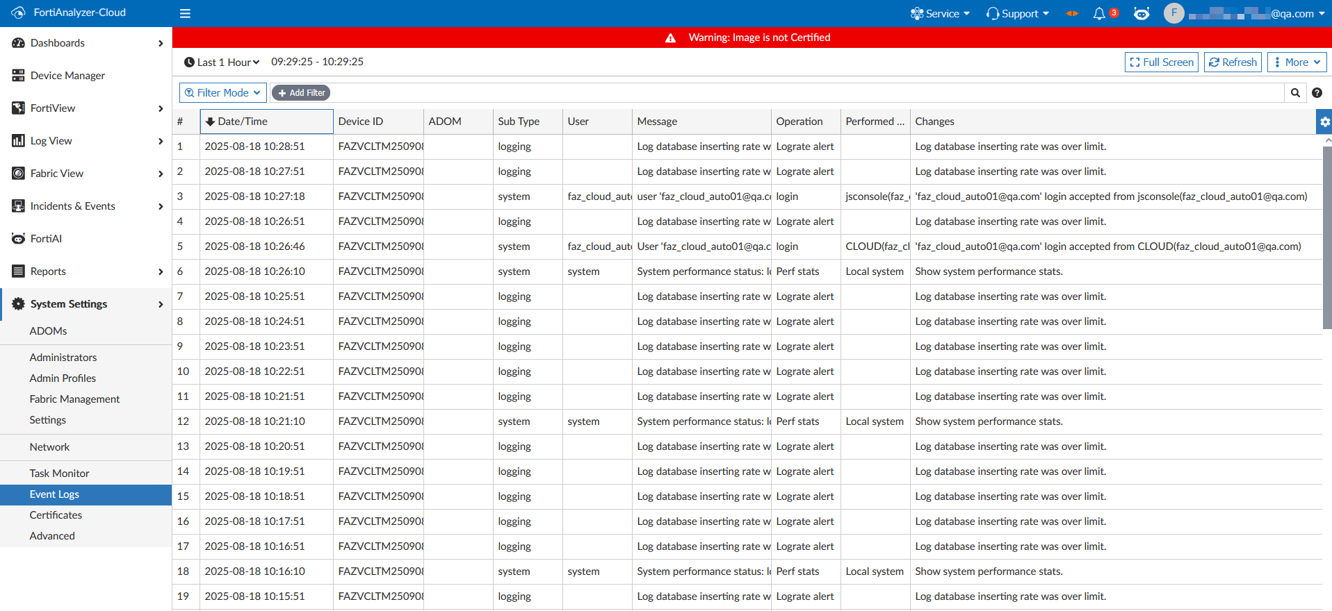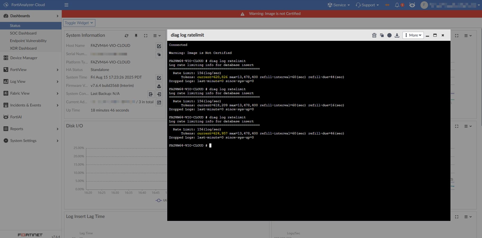 Log rate limiting info for database insert ============================================= Rate Limit: 156(log/sec) Tokens: current=570,958 max=13,478,400 refill-interval=60(sec) refill-due=37(sec) Dropped Logs: last-minute=0 since-sys-up=0Rate LimitThe maximum number of logs that FortiAnalyzer Cloud per second. This is the same as the Peak Log Rate. Tokenscurrent: The number of tokens currently available.max: The maximum number of tokens available in a 24 hour period.refill-Interval: The amount of time between each token refill.refill-due: The amount of time remaining until the next token refill. When therefill-dueamount reaches0, the tokens will be refilled.Dropped Logslast-minute: The number of logs dropped in the last minute.since-sys-up: The number of logs dropped since the system was started.